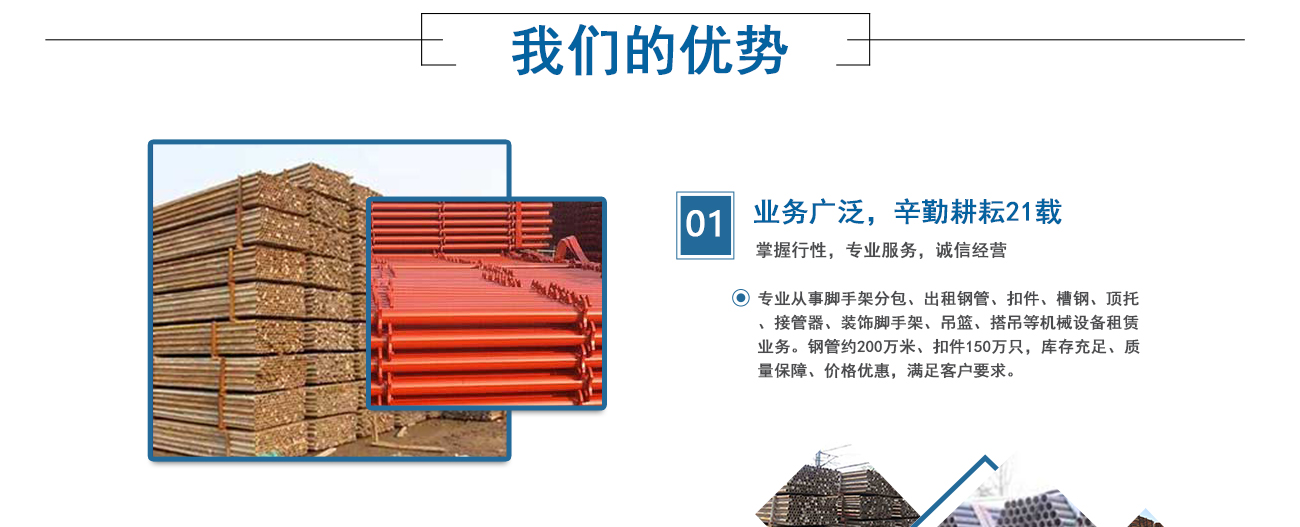 安徽海洋建筑工程機械租賃有限公司、淮南佳輝建筑工程有限公司是由淮南興勝鋼管租賃公司起家的,從事專業(yè)腳手架資質分包、鋼管、扣件、槽鋼、頂托、接管器、裝飾腳手架搭設、吊籃、搭吊等機械設備的租賃業(yè)務。公司成立于1999年,憑借著專業(yè)水準和成熟技術,在業(yè)內迅速崛起并不斷發(fā)展創(chuàng)新。